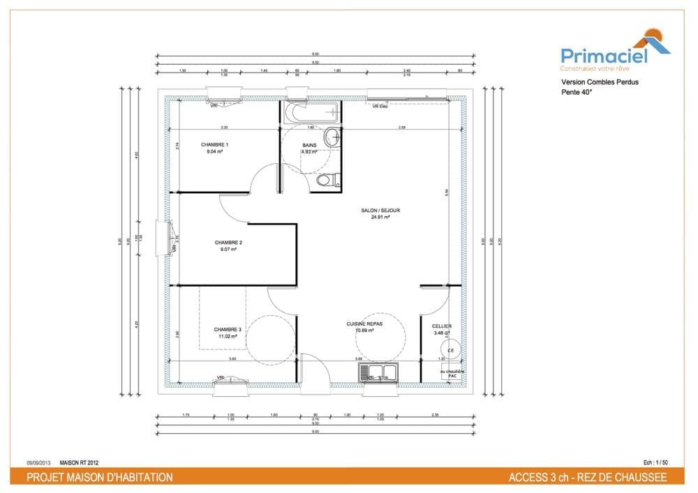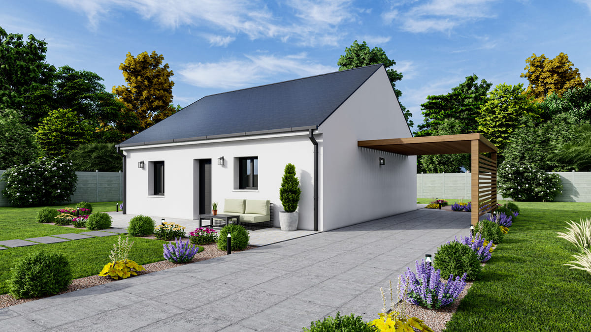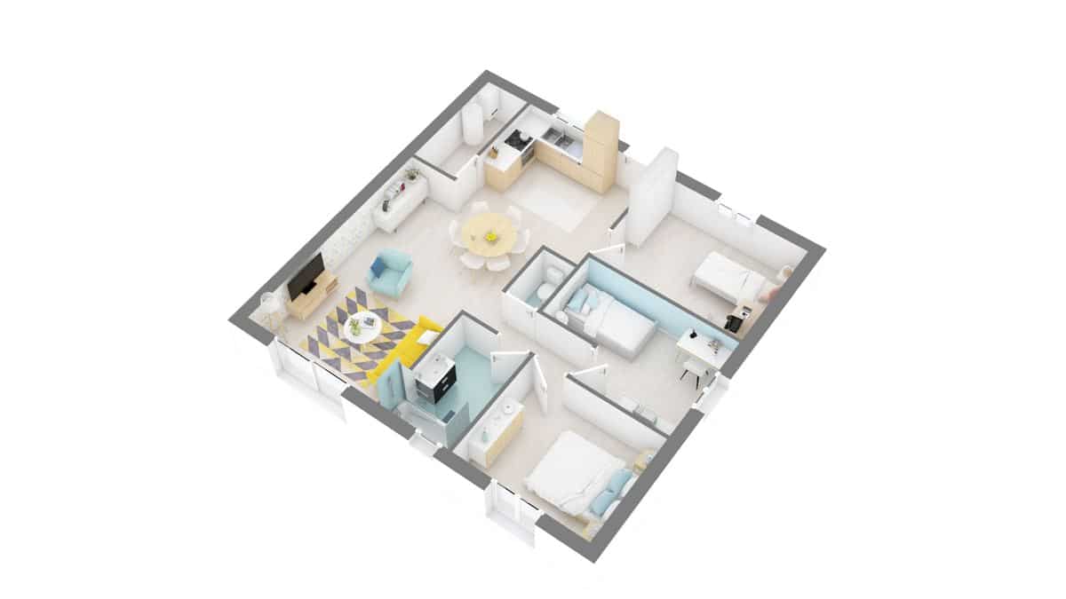 Cette maison Access, propose un plan de plain pied offrant 73m², avec 3 chambres. L’espace de vie, regroupant séjour et cuisine ouverte fait près de 35m² avec un cellier attenant de 3.5m². Les 3 chambres font toutes plus de 9m², et la salle de bain près de 5m². Des WC séparés complètent le tout.