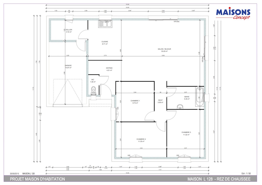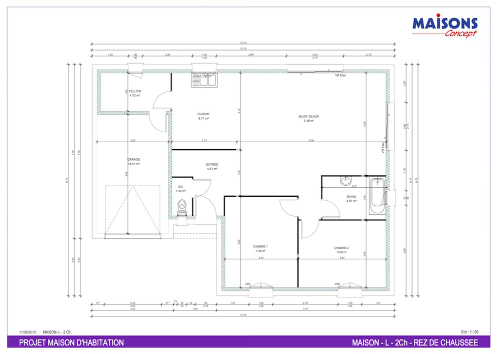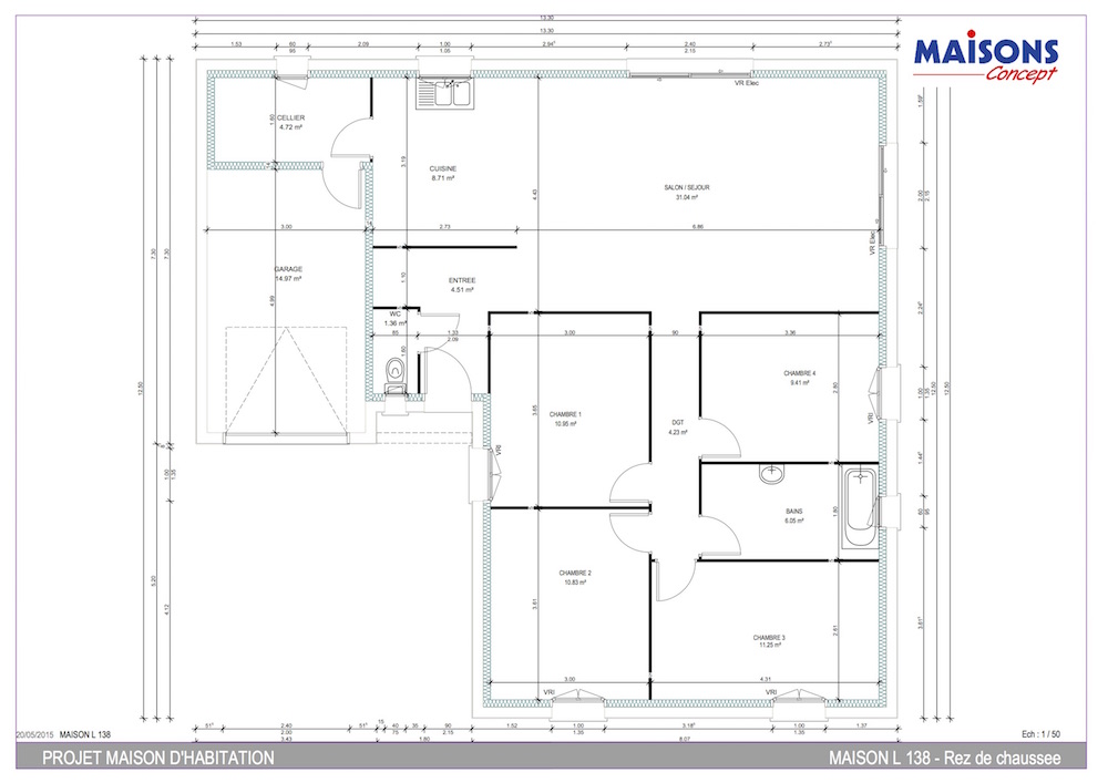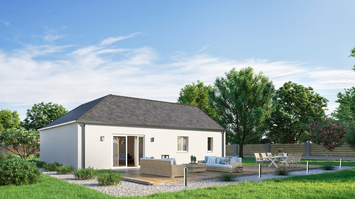 Cette maison de plain-pied possède un grand salon-séjour, jouxté d’une cuisine ouverte. Un garage attenant ainsi qu’un cellier viennent compléter ce bel ensemble. Cette maison est personnalisable pour s’adapter à votre mode de vie. L’espace-nuit avec sa salle de bain peut être de 2, 3 ou 4 chambres.