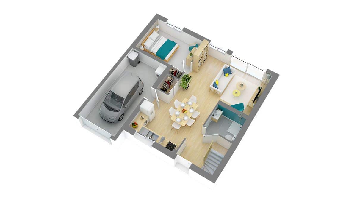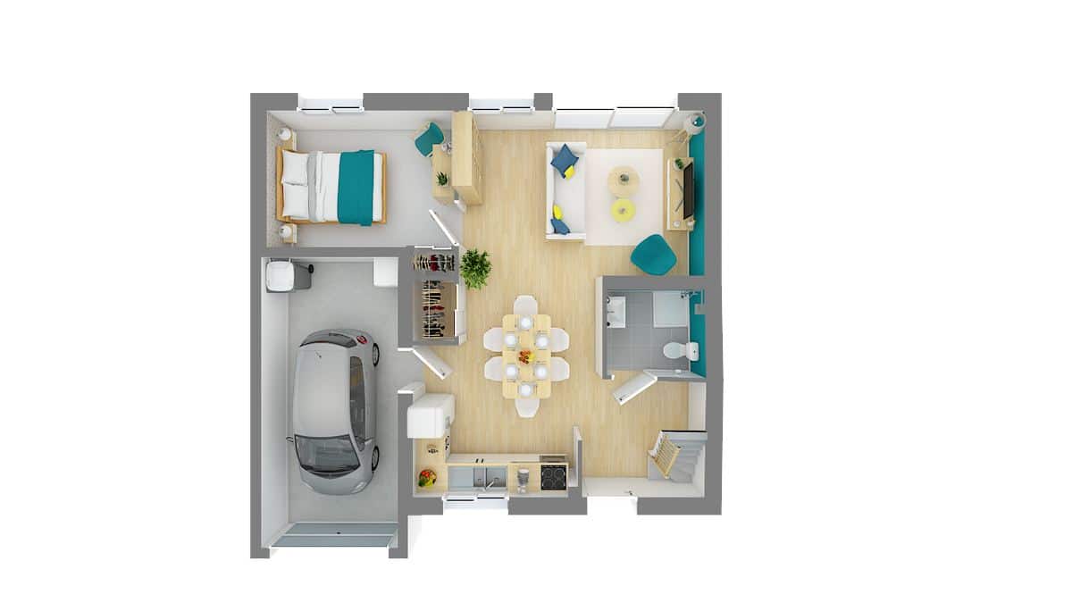 Le modèle Jade est une maison à étage particulièrement confortable et design vous proposant un vaste rez de chaussé avec garage intégré de près de 17m² donnant sur une grand pièce de vie avec cuisine ouverte de 36 m². Le rez de chaussée comprend également une salle d’eau ainsi qu’une chambre de 11,2m² ( ou alternativement une pièce de vie de près de 50 m² en supprimant cette chambre).