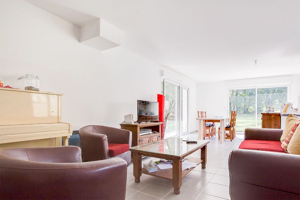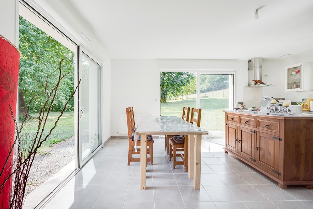 Les ouvertures vers l’extérieur, sous forme de baies vitrées et portes-fenêtres ont la part belle dans cette demeure ! Cela donne une sensation de grande bouffée d’air frais ! Son séjour-salle à manger en bénéficie grandement. La cuisine ouverte, avec son ilot central associe fonctionnalité et convivialité de par sa proximité avec l’espace repas. Rien n’y manque !