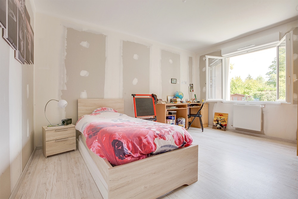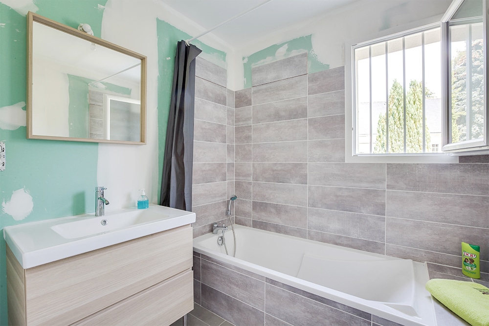 Les chambres sont de belle taille tout comme la salle de bains, qui accueille une belle baignoire encastrée. Le prolongement en carrelage sera la petite touche pratique qu’on appréciera pour y déposer les produits de toilette.