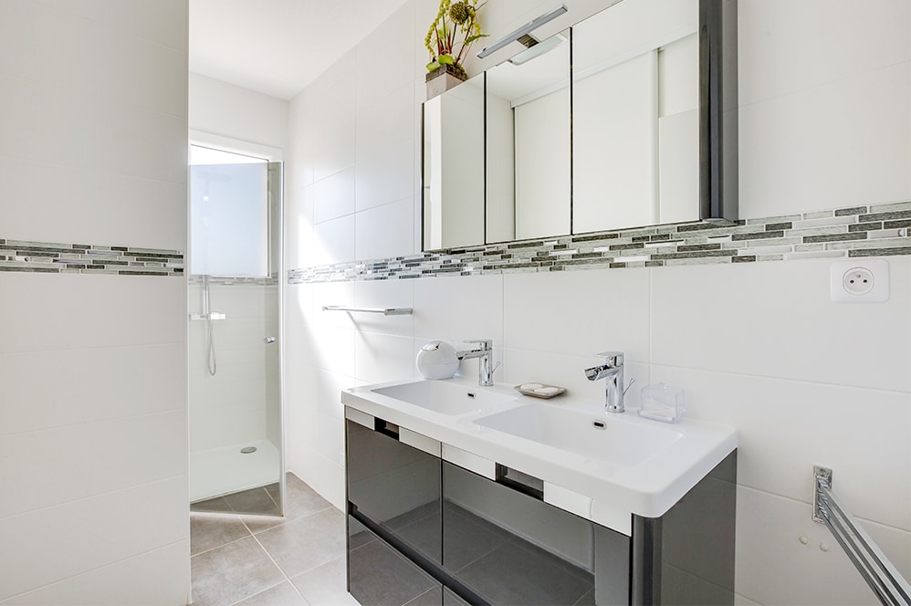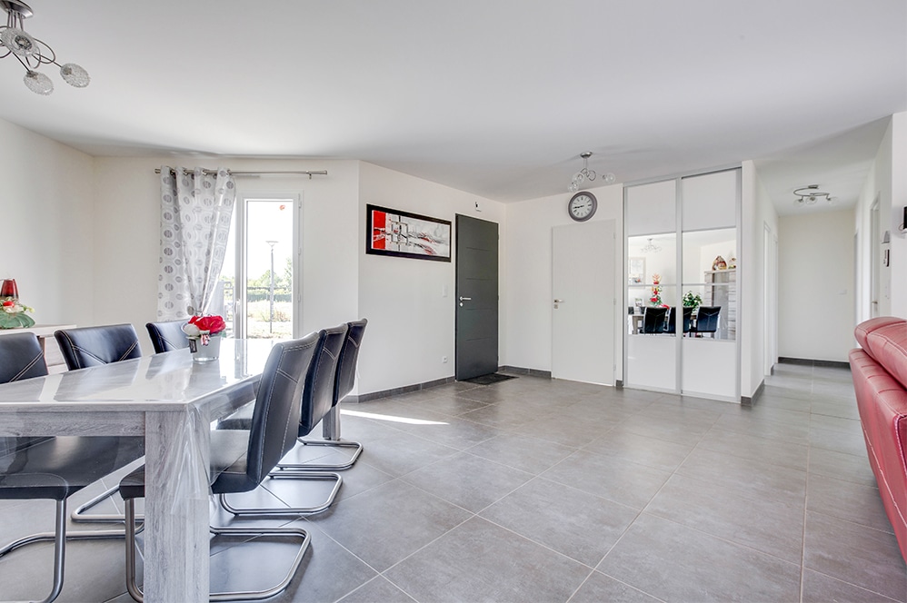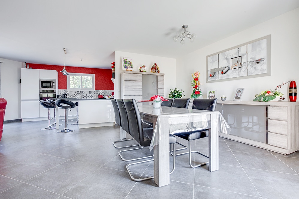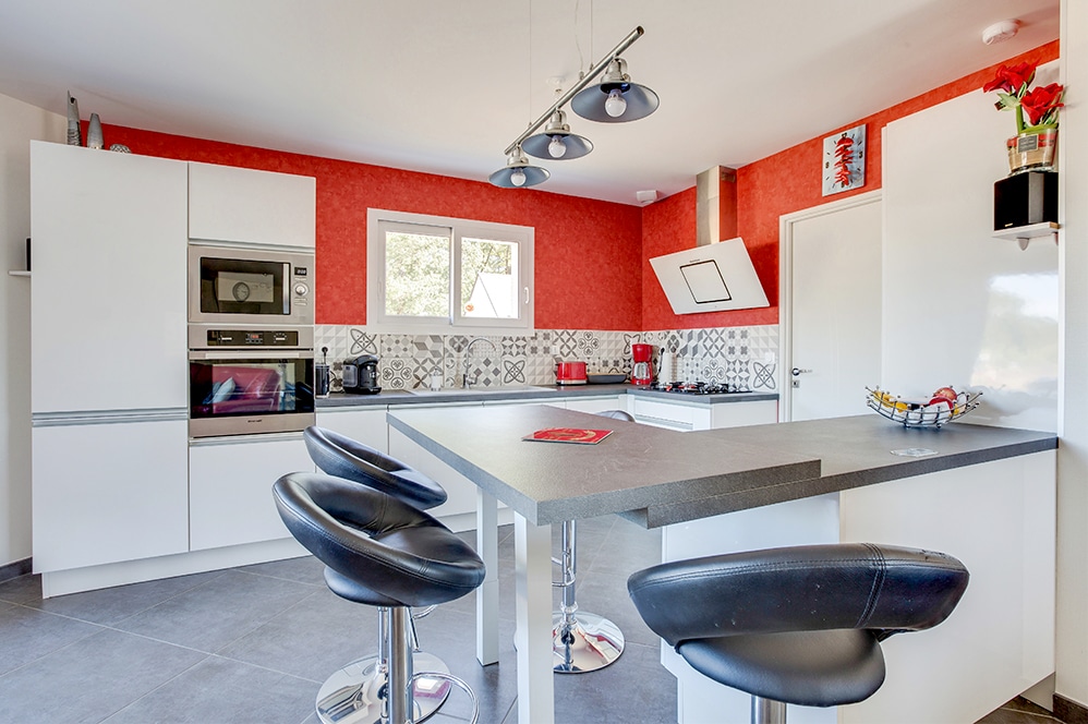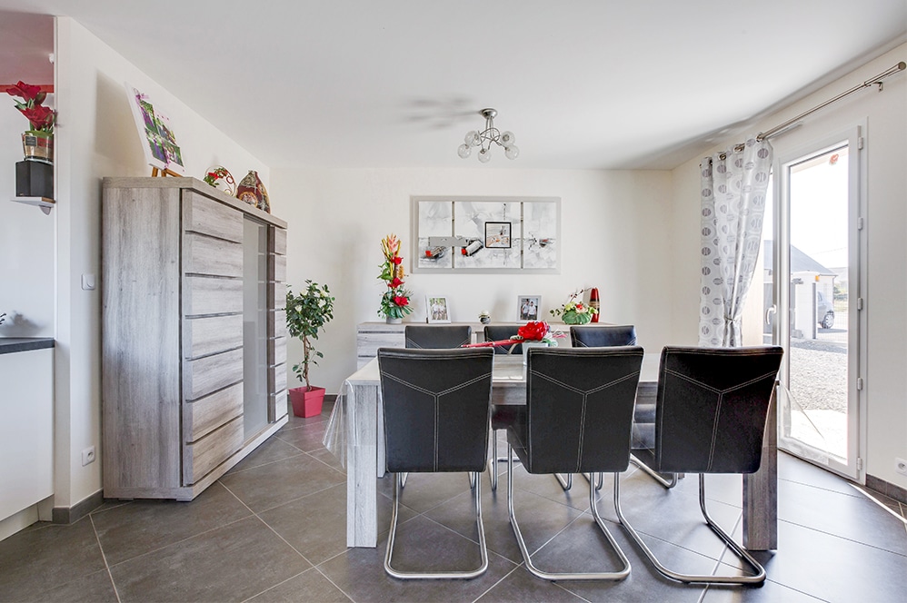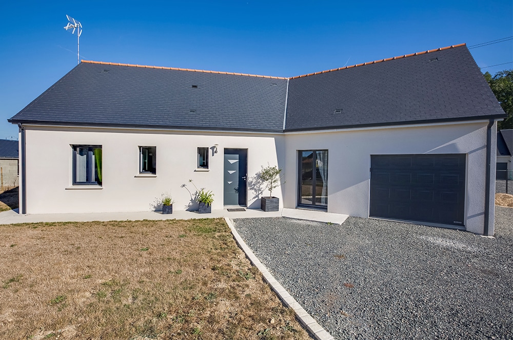 Maisons Concept vous présente cette grande maison en angle cassé, à la ligne très particulière, située à Ferrière-sur-Beaulieu dans l’Indre. Son beau toit en ardoise au faîtage couleur tuile séduit. C’est une bâtisse de plain-pied munie d’un grand garage intégré. Les formes particulières de son architecture confèrent à son intérieur une véritable originalité. De fait, on trouve à son grand séjour assorti de sa cuisine ouverte un cachet particulier.